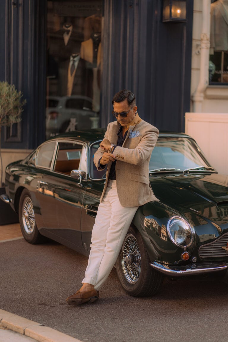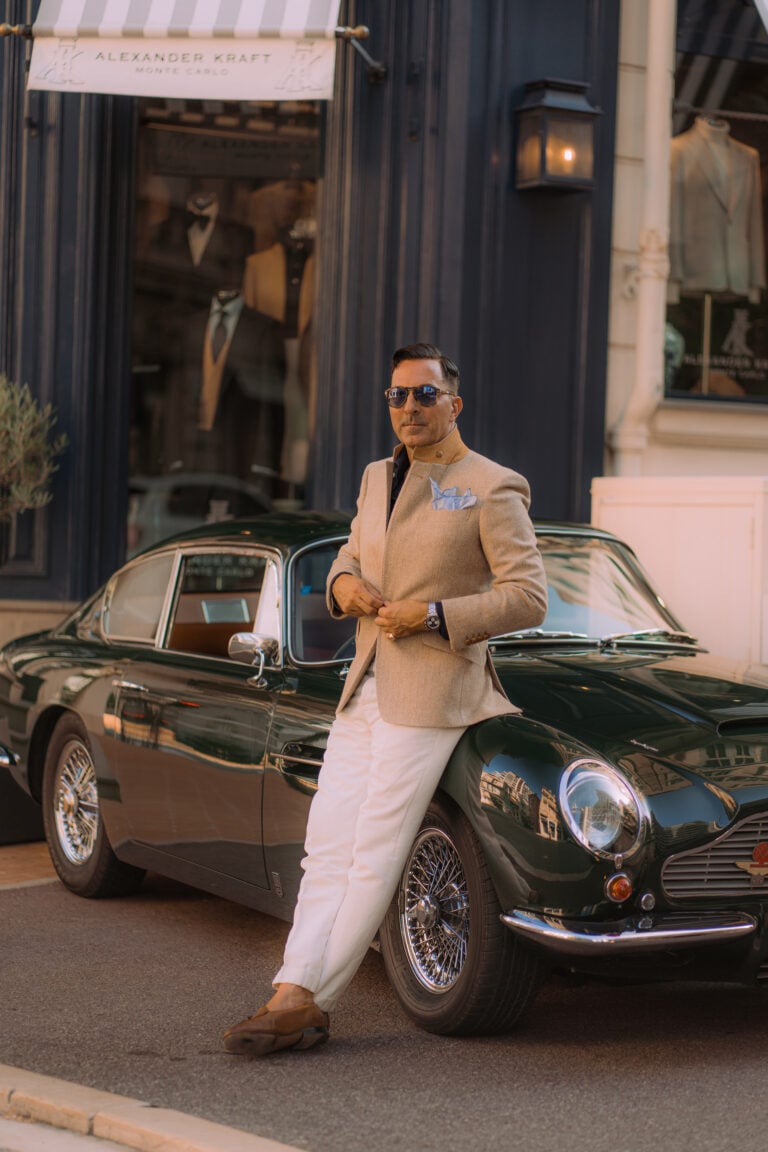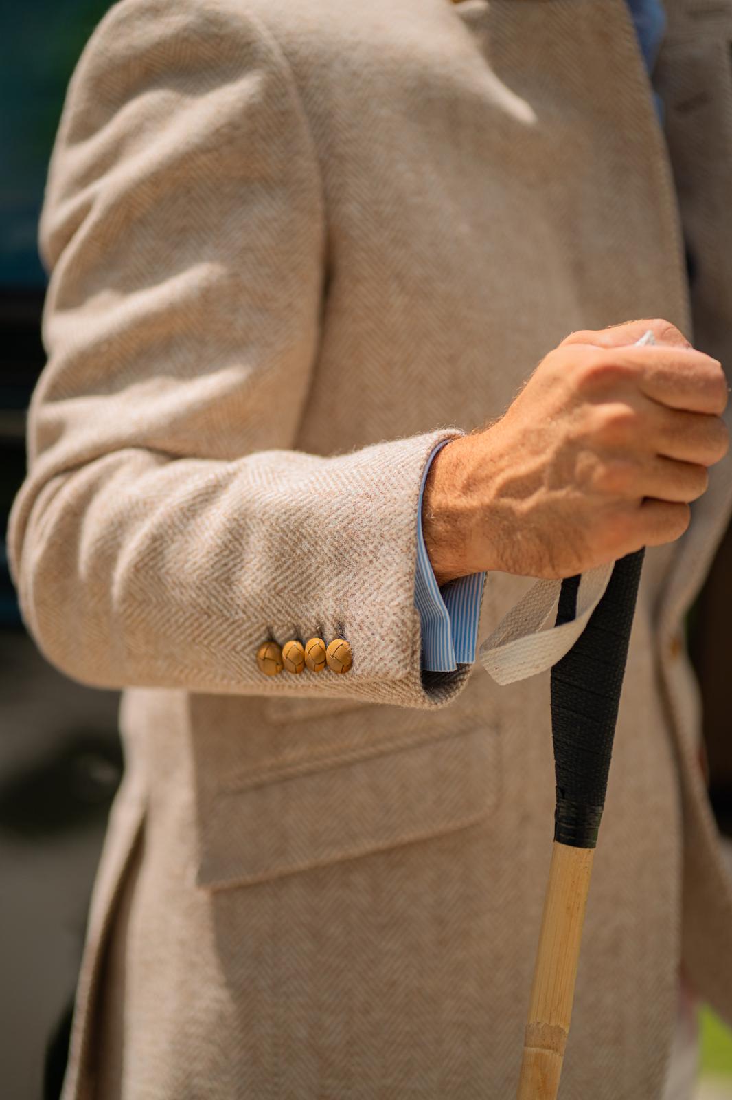 Distinctive bespoke touches include real leather “football” buttons, working cuffs, and a silk flower loop discreetly positioned for a boutonniere. The undercollar, crafted from Alcantara, adds a subtle note of luxury. With its half-canvas construction, this jacket guarantees a superior fit and enduring quality, making it a timeless addition to any wardrobe.