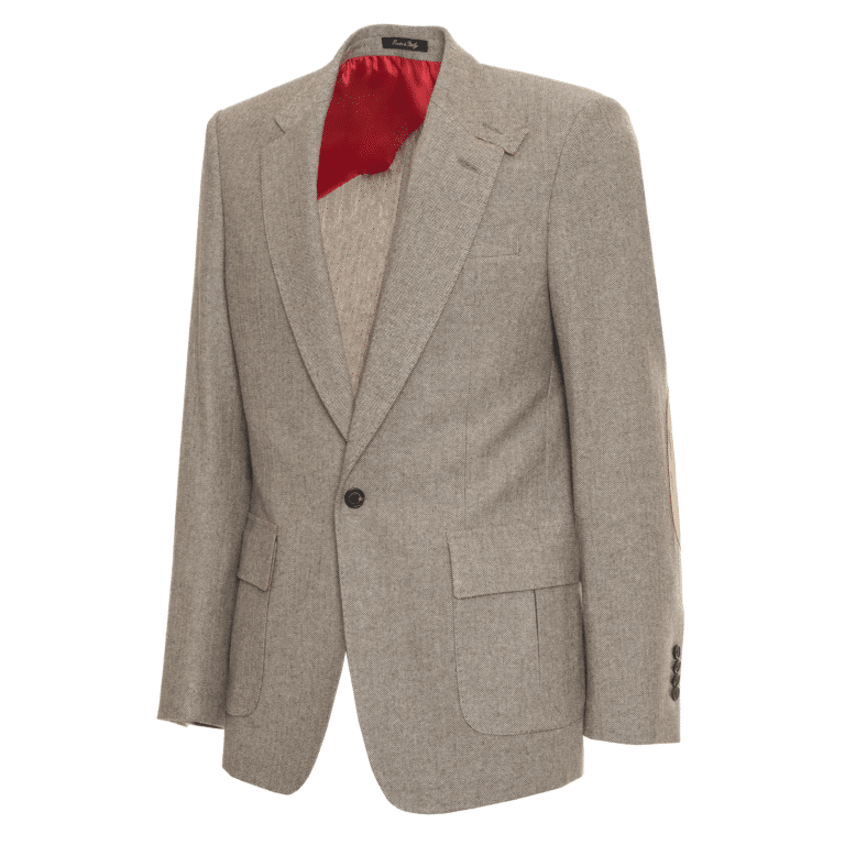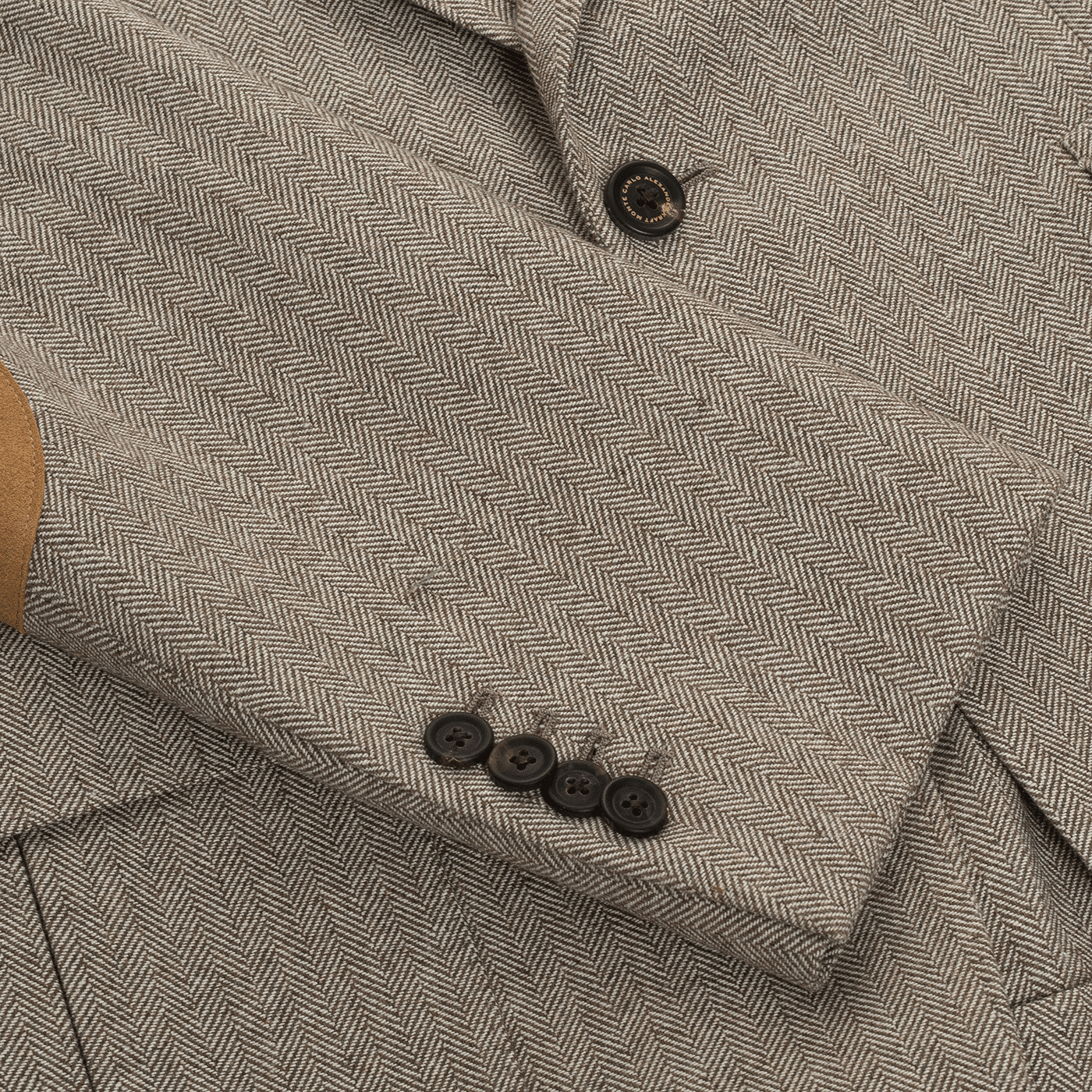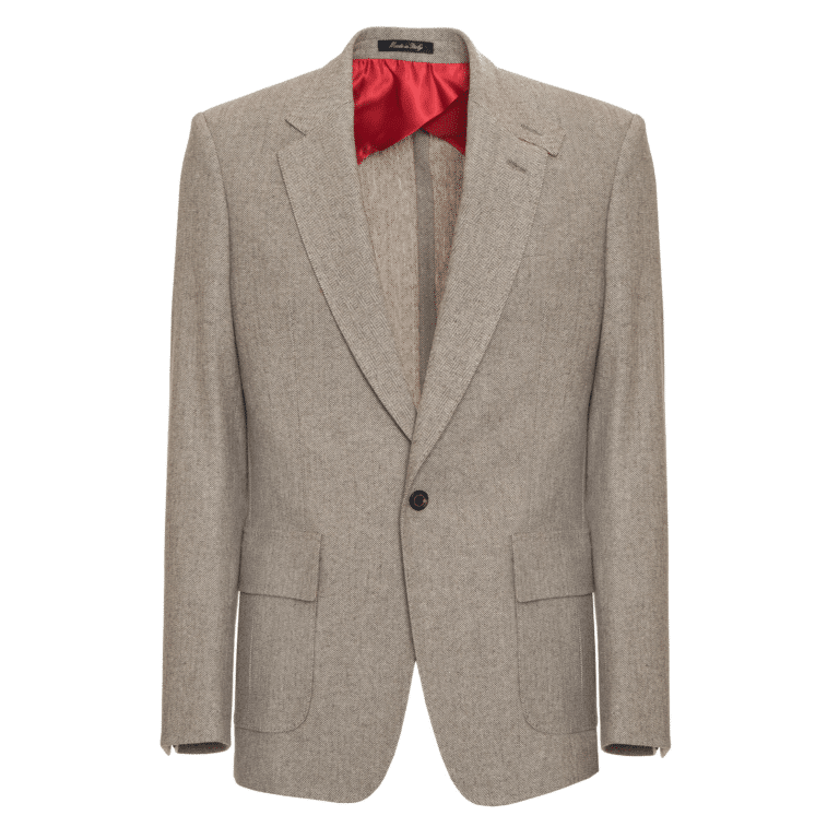 The silhouette has been informed by the bespoke tradition and has a close fitting, lightly shaped chest and a nipped-in waist. Other bespoke touches include the real horn branded buttons, working sleeve cuffs and the silk thread attached on the underside of the lapel to accommodate your boutonniere.