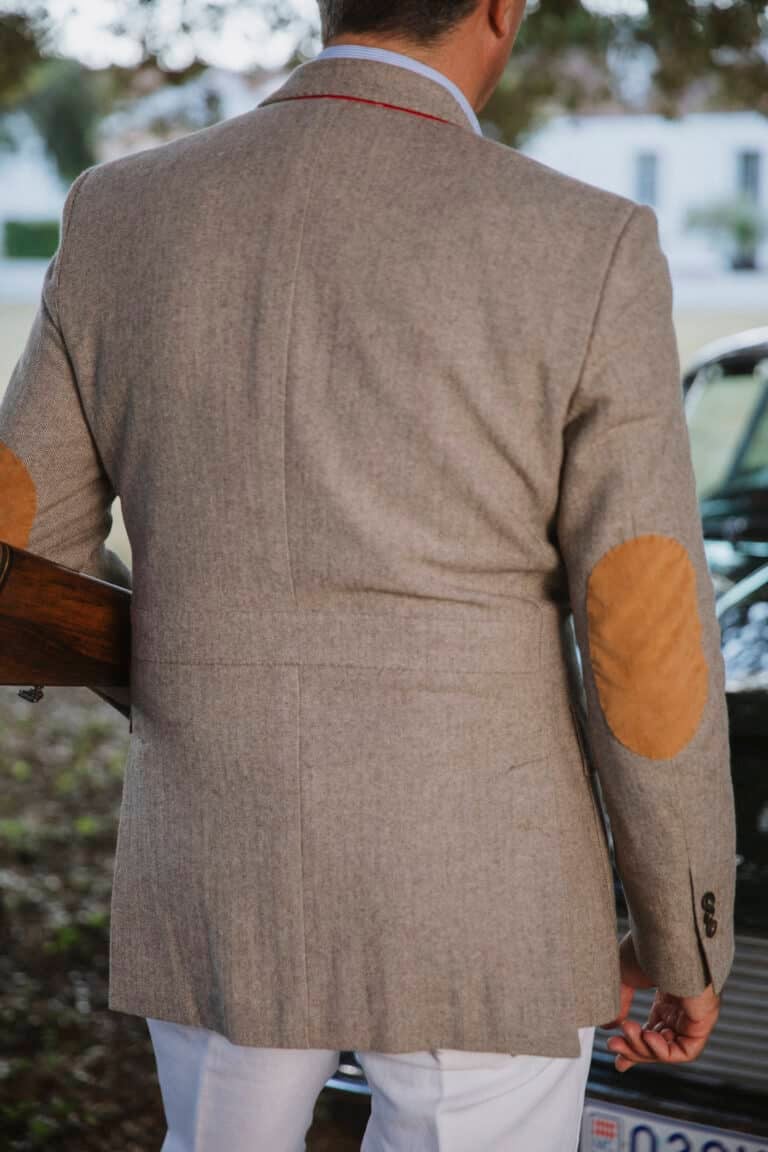 Cut on our updated Provence house model it boasts a medium width notch lapel with a grown-on storm-tab, side vents, pleated-patch-and-flap side pockets as well as a half-belt detail at the back in the style of classic 1930s resort tailoring. The jacket sleeves have classic elbow patches realised in Alcantara which is thoughtfully matched on the underside of the collar. Alcantara is a premium man-made textile that is used to upholster many luxury automobiles as it has the softness and lustre of suede but the advantage of not requiring specialist care. The jacket has been only partially lined for maximum comfort by allowing the cotton to breath.