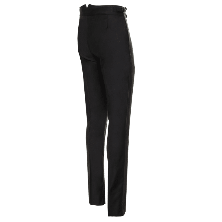 Designed to complement the signature dinner jacket, the AK MC wool & silk evening trousers are cut high in the waist with a flat front with a slim, tapered fit. The waistband had been cut deeper, negating the need for a cummerbund and perfectly framing a well-fitting waistcoat. To complement the buckle and strap side-adjusters, there are six buttons thoughtfully sewn inside the waistband should you prefer to wear braces. As is traditional, there are no pockets on the hip and the side pockets are cut parallel to the black single satin ribbon that adorns the side seam.