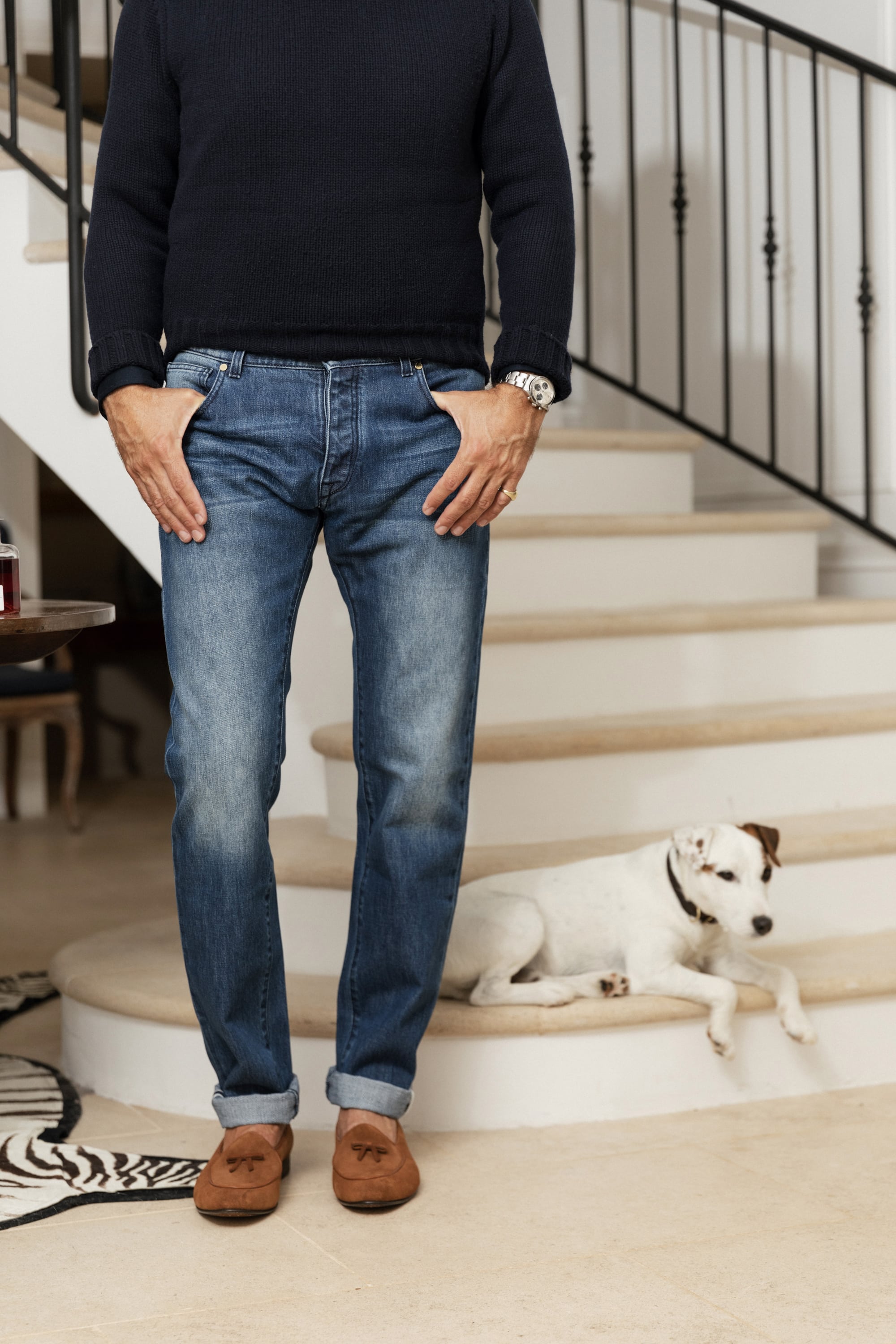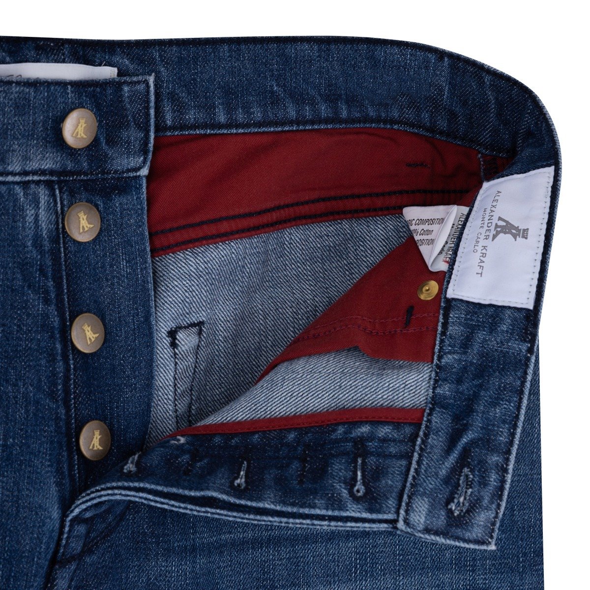 Alexander Kraft’s quest to create the perfect pair of jeans was motivated by his frustration with the offerings available on the market. While there are countless models available, quite often the choices are extreme: either they consist of high-end “designer jeans” that cost a small fortune and boast lots of useless design gadgets, or they are cheap fast fashion items, made in sweatshops at the other end of the world from inferior denim and under horrific conditions. Many jeans nowadays seem to have more holes than cloth, and it is probably best to politely gloss over super skinny jeans that require shoe horns to get in, or Seinfeld-era inspired dad jeans that make even super models and athletes look… highly unflattering!nnSo Alexander Kraft set out to create a pair of jeans that is made to the highest sartorial standards, but is universal in appeal and discreet in its perfection: The result: The AK MC “Perfect Jeans”, here in the “Japanese selvedge” edition that will appeal to true jeans connoisseurs. These jeans are slim, but not skinny. They’re made from the finest Japanese selvedge denim and feature a mid-rise and are very comfortable to wear, but still visually flattering. Their dark color is typical of Japanese selvedge denim and the carefully created fade looks 100% natural, suggesting years of loving use. Made from high-quality, 14 ounce Japanese selvedge denim, they can be rolled up (thereby exposing the red selvedge seam), cut or shortened according to personal preference. Noteworthy details include solid brass buttons that have been engraved with the AK MC logo, red pockets and lining (invisible from the outside) and even a small woven label with Alexander Kraft’s favorite Italian proverb ‘La classe non è acqua (class is not built on water). They are truly the perfect pair of jeans, looking equally good in a bar dressed up with a shirt and blazer as they do on a sofa with just a polo shirt.