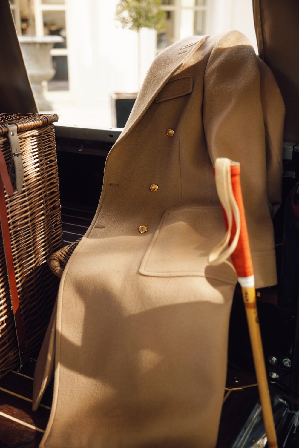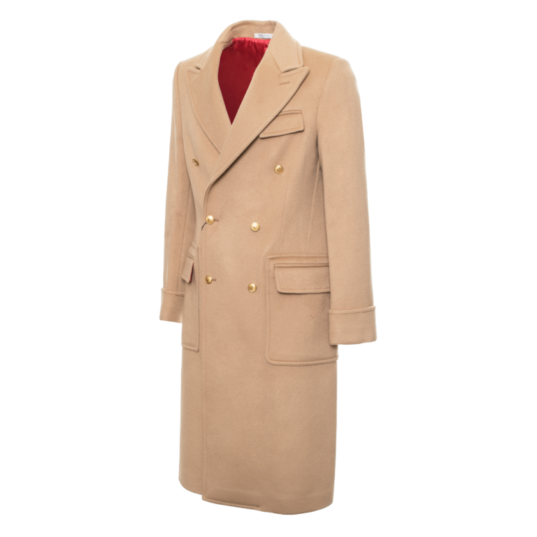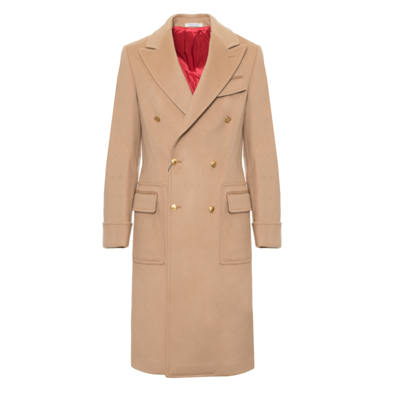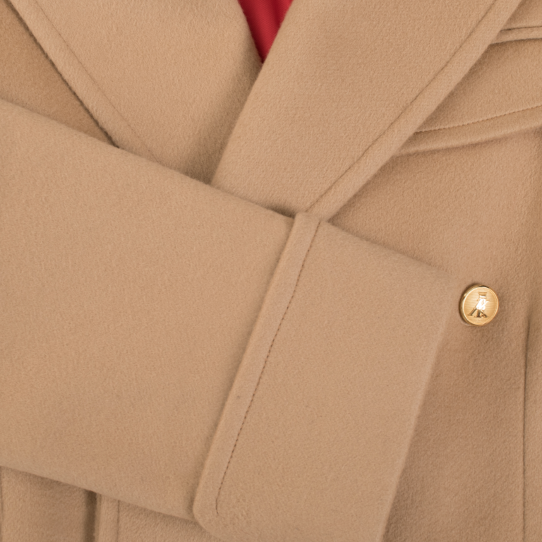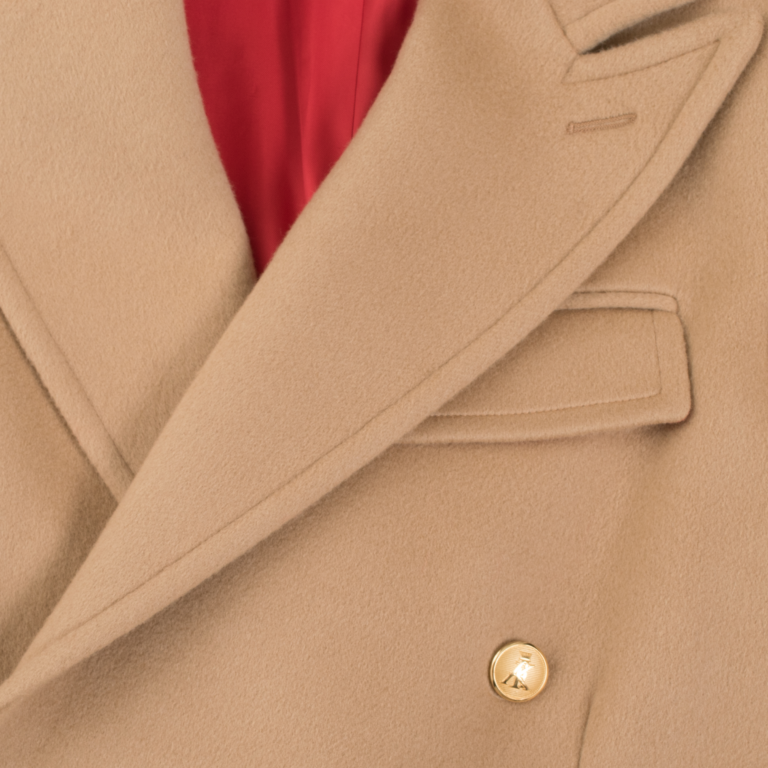 While retaining the coat’s iconic style, the silhouette has been subtly refined, offering a shorter, more tailored fit. Signature details include a contrasting red silk lining, a luxurious red felt undercollar, turn-back cuffs, and a rakish half-belt at the back—all expertly crafted by an artisanal workshop in Southern Italy. Staying true to our commitment to quality, the coat is made from a sumptuous wool-cashmere blend in a rich camel shade, ensuring both comfort and elegance.