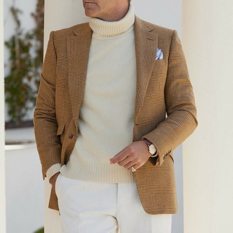Made in Italy in a family-owned workshop in Puglia, they use soft tweed from the famed Lovat Mill in Hawick, Scotland, which is generally recognized as “The Home of Tweed.” It is double vented jacket, elegant in nature with its caramel colour and classic Prince-of-Wales overchecks. Its contemporary half-lining makes for a lighter, softer construction, underlining its ability to work well out on the shooting field, either on its own or underneath a coat, or in the city. It comes with matching trousers and waistcoat all sold separately to complete its refined look.