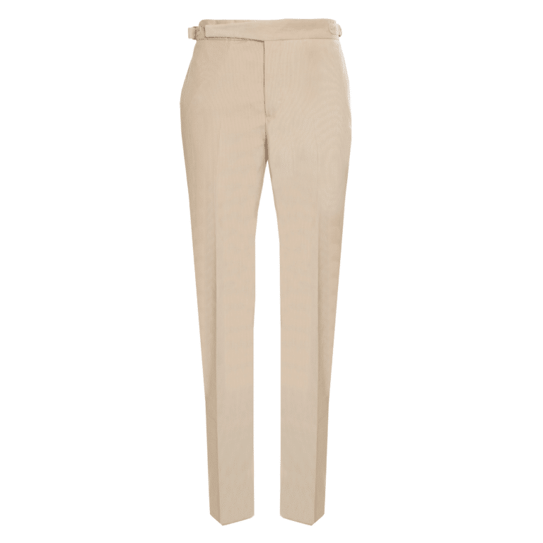For many years now, Gurkha trousers have been a favorite of Rakish men around the world. Named after fearsome Nepalese warriors who were recruited into the British Army from the 19th century on, these trousers usually feature a high waist, a wide waistband, double pleats and double fasteners. While their aesthetic is certainly striking and often supremely elegant, Alexander Kraft personally found the traditional closing mechanism with opposite buckles rather cumbersome; at the same time, he has always preferred the clean look of flat front trousers. So he decided to create a contemporary version of the Gurkha that featured the clean, flat front – look of his highly successful « Riviera » model but added a slightly enlarged the waistband while also lengthening the front buckle. Thus, he combined the best of all worlds: The Gurkha – inspired waistband and fastener, with the clean look and ease-of-use of « normal » trousers. As usual, the trousers feature side adjusters.