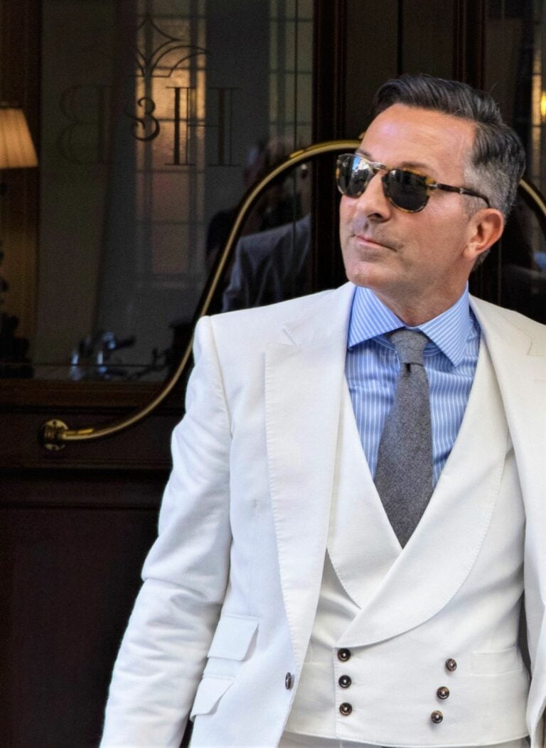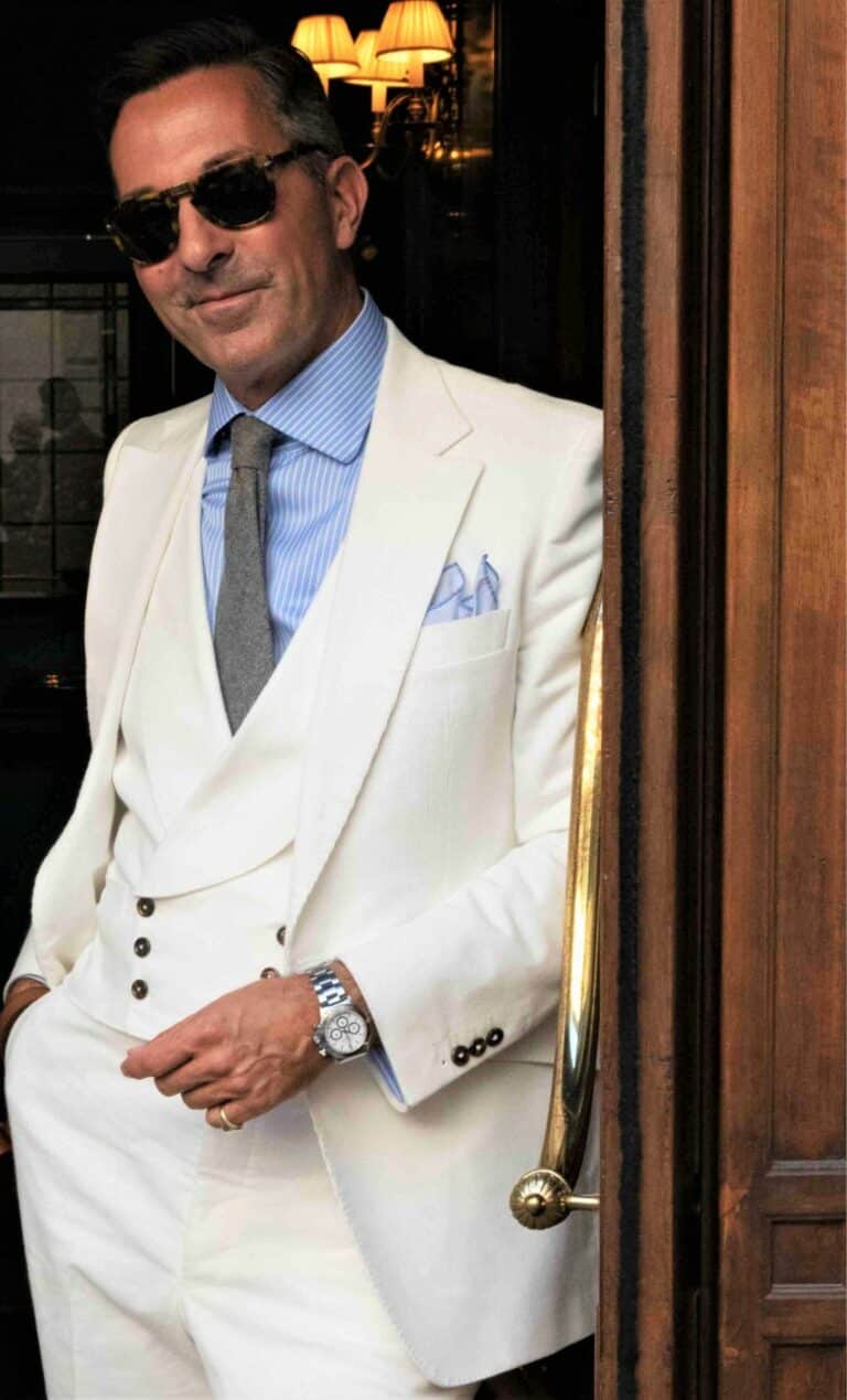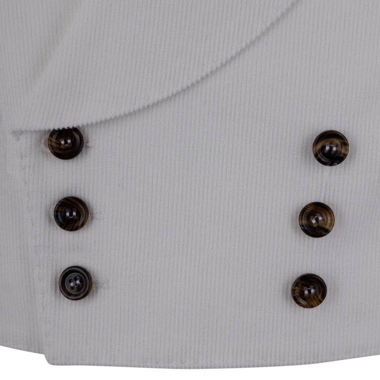 This version of the iconic AK MC double-breasted waistcoat is made from a super-soft cotton corduroy in an understated, highly elegant off-white. The waistcoat features a stunning shawl lapel and real horn buttons, making it an incredibly rakish number when paired either with the matching Signature jacket and Riviera trousers to form a striking, highly elegant yet comfortable suit for all seasons, or – for a more casual look – with jeans or the off-white linen/cotton trousers from the Alexander Kraft Monte Carlo Collection.