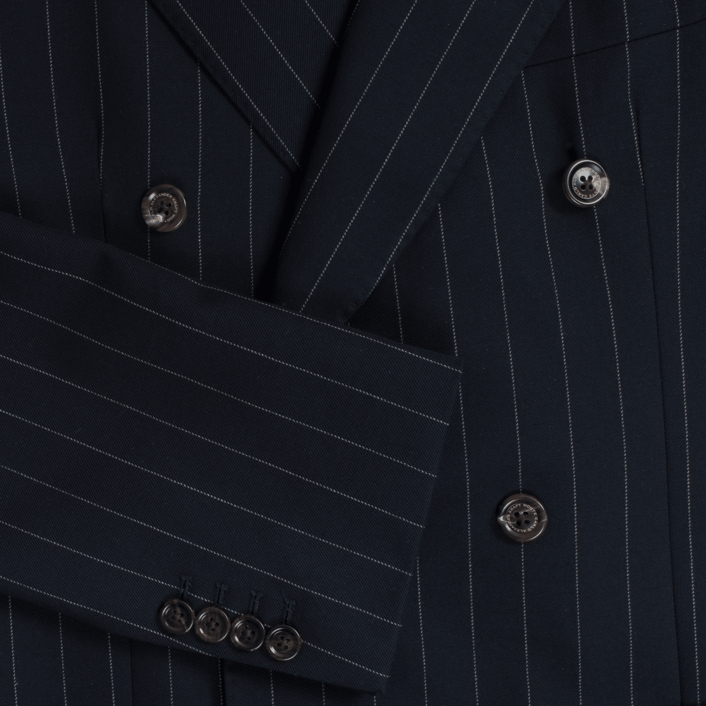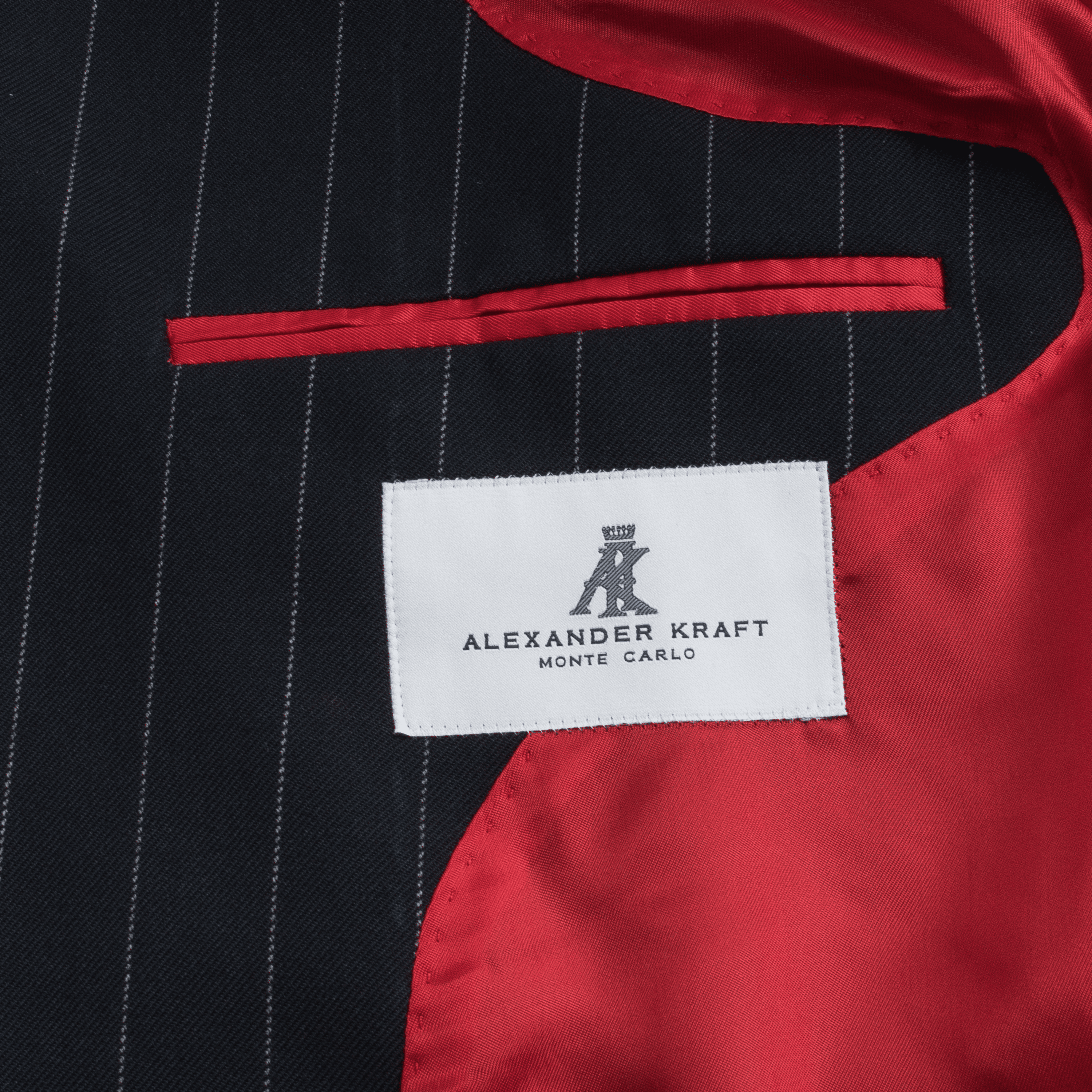 The bespoke tailoring – inspired, Signature double-breasted cut of Alexander Kraft Monte Carlo boasts a generously proportioned peaked lapel, Southern Italian Barchetta-shaped patch pockets (inspired by Neapolitan bespoke tailoring) and side vents. The Savile Row – inspired silhouette combines a strikingly elegant appearance with maximum comfort thanks to high armholes, roped shoulders, a delicately shaped chest and a nipped-in waist. Other bespoke touches include real horn buttons, working cuffs and a flower loop (a silk thread attached on the underside of the lapel to accommodate a boutonniere). The jacket features a half-canvas construction with a partial lining for a perfect combination of artisanship, lightness and comfort.