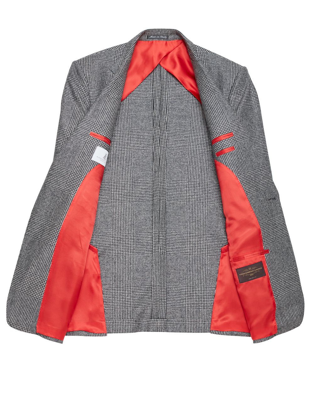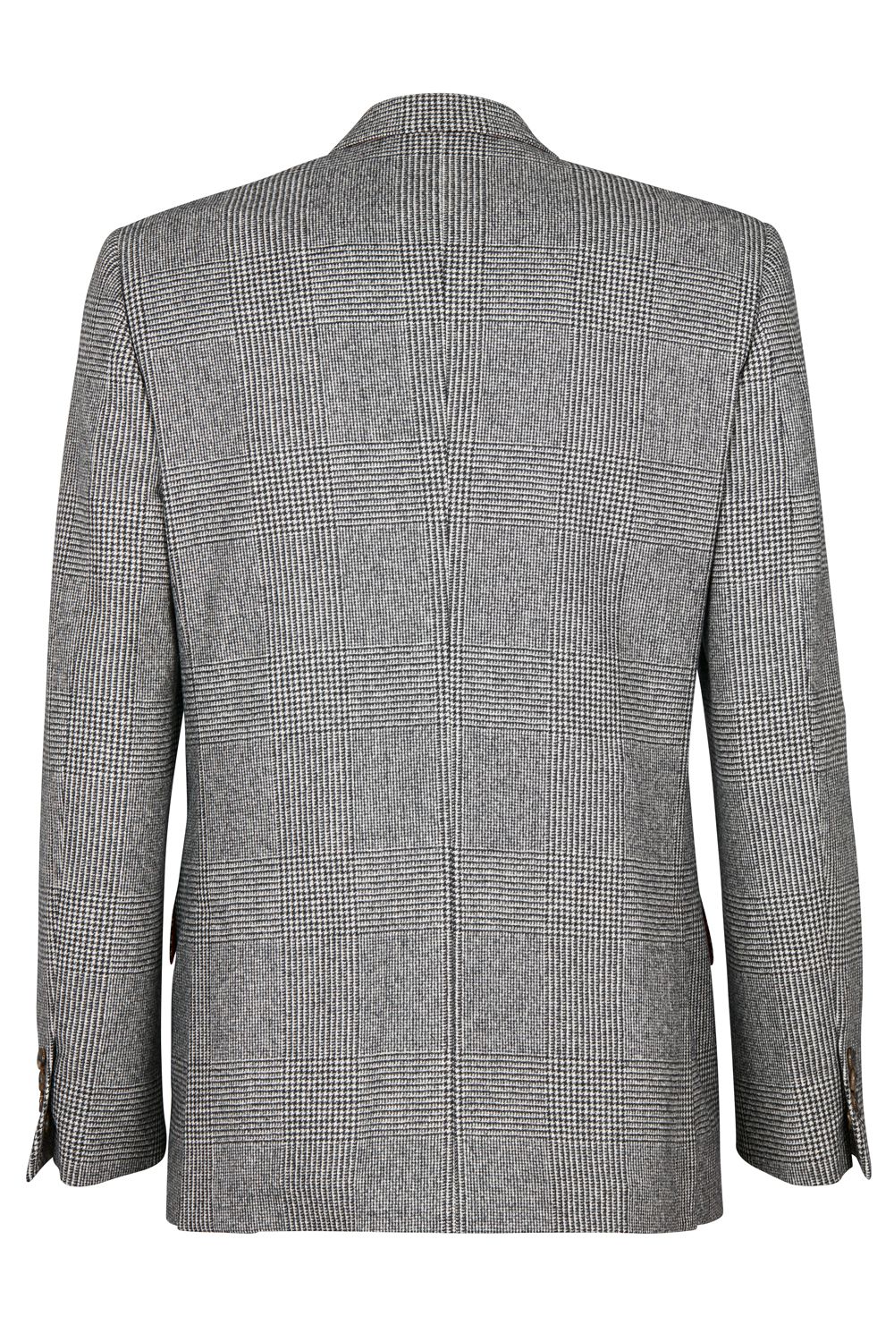 A special order grey Prince of Wales check flannel from esteemed mills, Vitale Barberis Canonico, especially for the Alexander Kraft Monte Carlo collection. The rakish James Jacket is loosely inspired by the 3-piece suit worn by Sir Sean Connery in Goldfinger. Made in a family-owned workshop in Puglia, it is cut with the waist nipped in, a medium-width lapel and close to the chest. It features double vents, slanted pockets including a ticket pocket, and real horn buttons. The half-lining in the signature bright red silk makes it lighter and less restrictive. Perfectly aligned patterns are a telltale sign of the exquisite sartorial craftsmanship. It can be worn as part of a three-piece suit, or on its own with jeans for a less formal but elegant look. You can also find a matching jacket and trouser all sold separately.