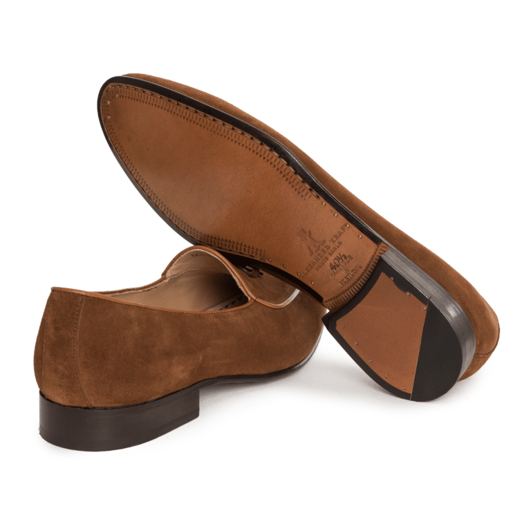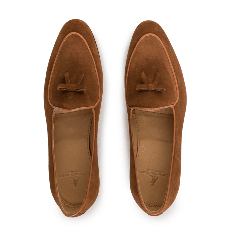 In creating his perfect pair of Belgian loafers, Alexander Kraft addressed these two points by designing a bespoke, slightly more closed, elongated shape that adds a touch of masculinity to this particular model. In addition, the Alexander Kraft Monte Carlo Belgian loafers are hand-made by a small, artisanal cobbler in Portugal, and feature Blake-stitched leather soles of the highest quality. The material chosen is a precious caramel – colored suede leather with the traditional bow and slightly lighter calf piping as a discreet accent. These supremely elegant, hand-made shoes are incredibly comfortable to wear and extremely versatile to style, making them a must-have for any connoisseur’s wardrobe.