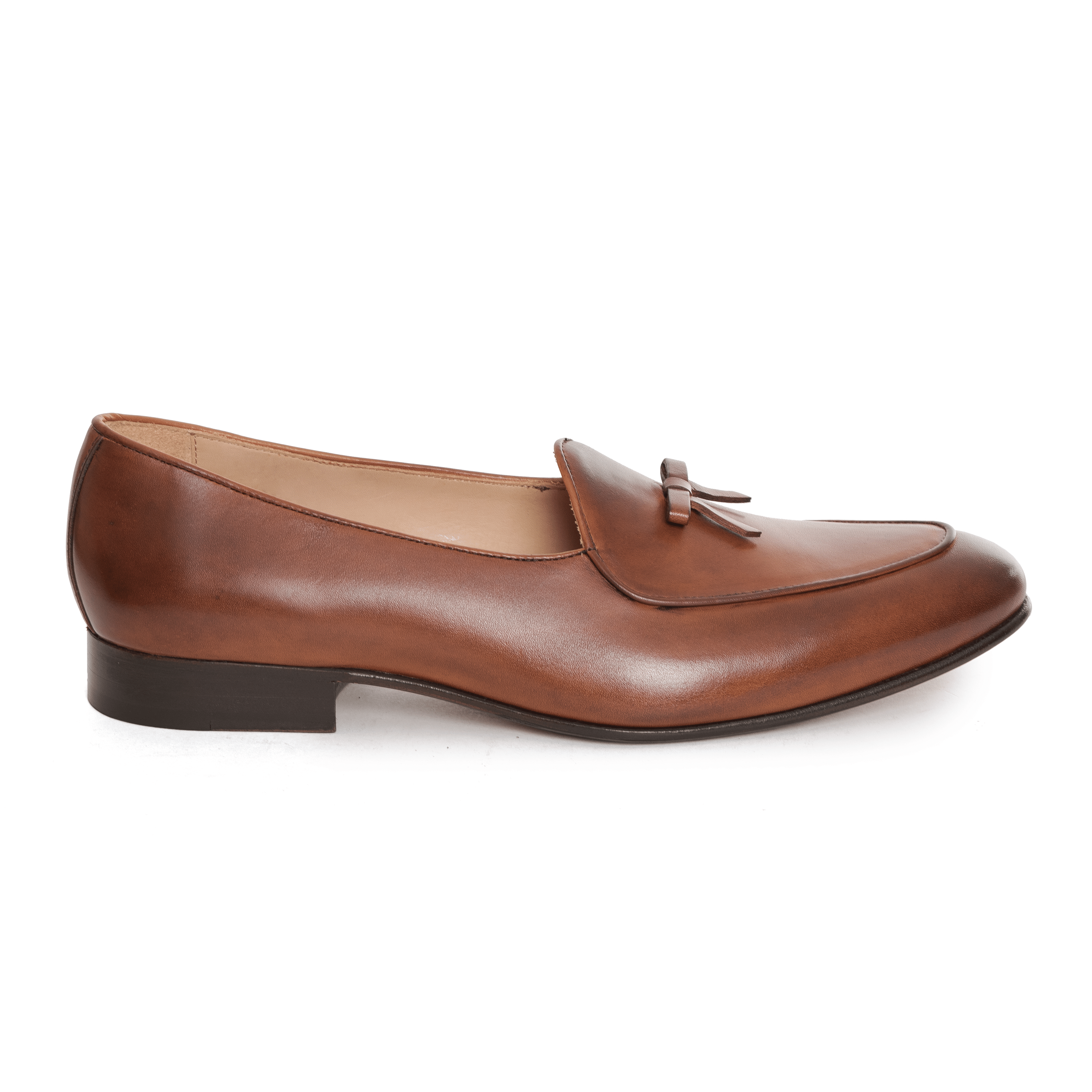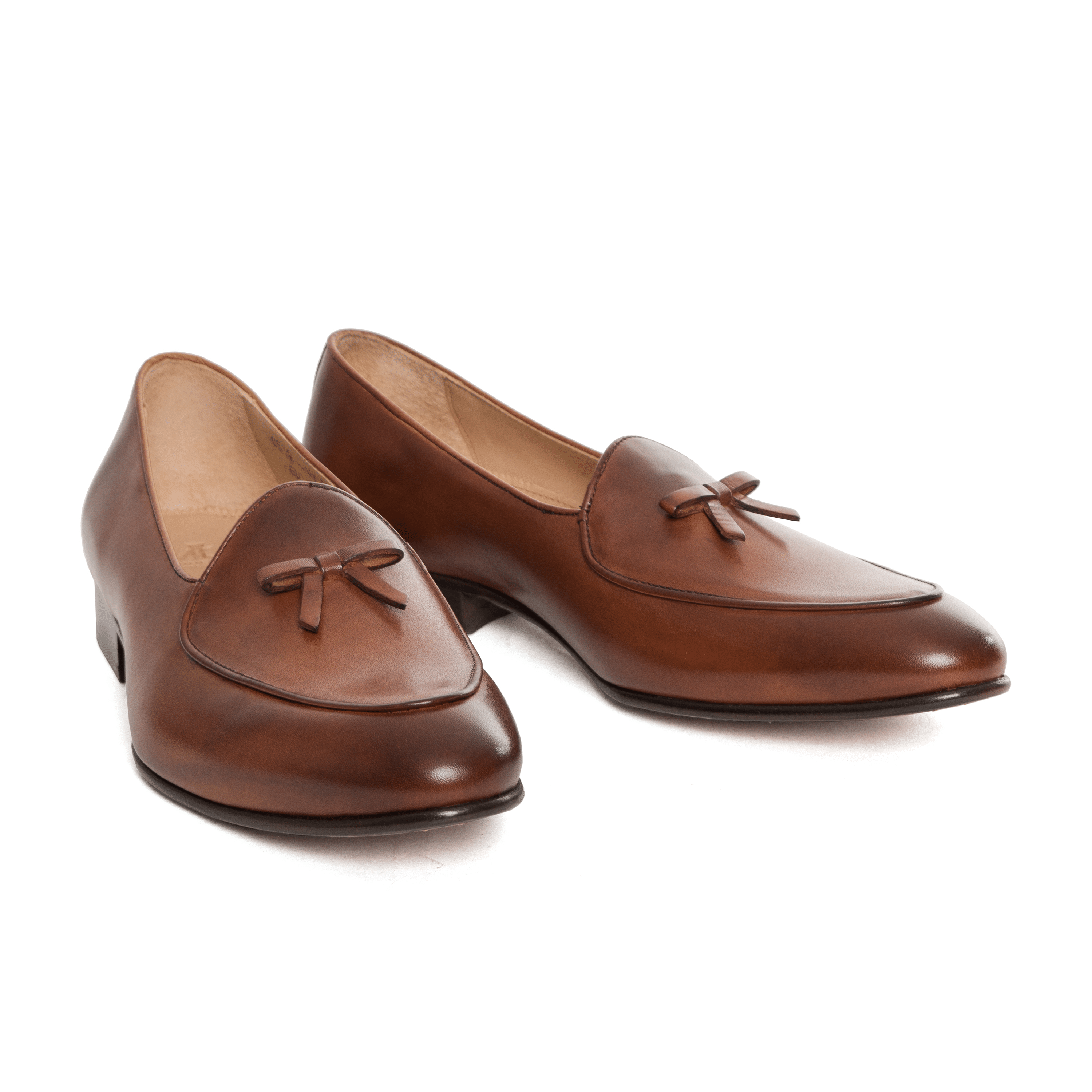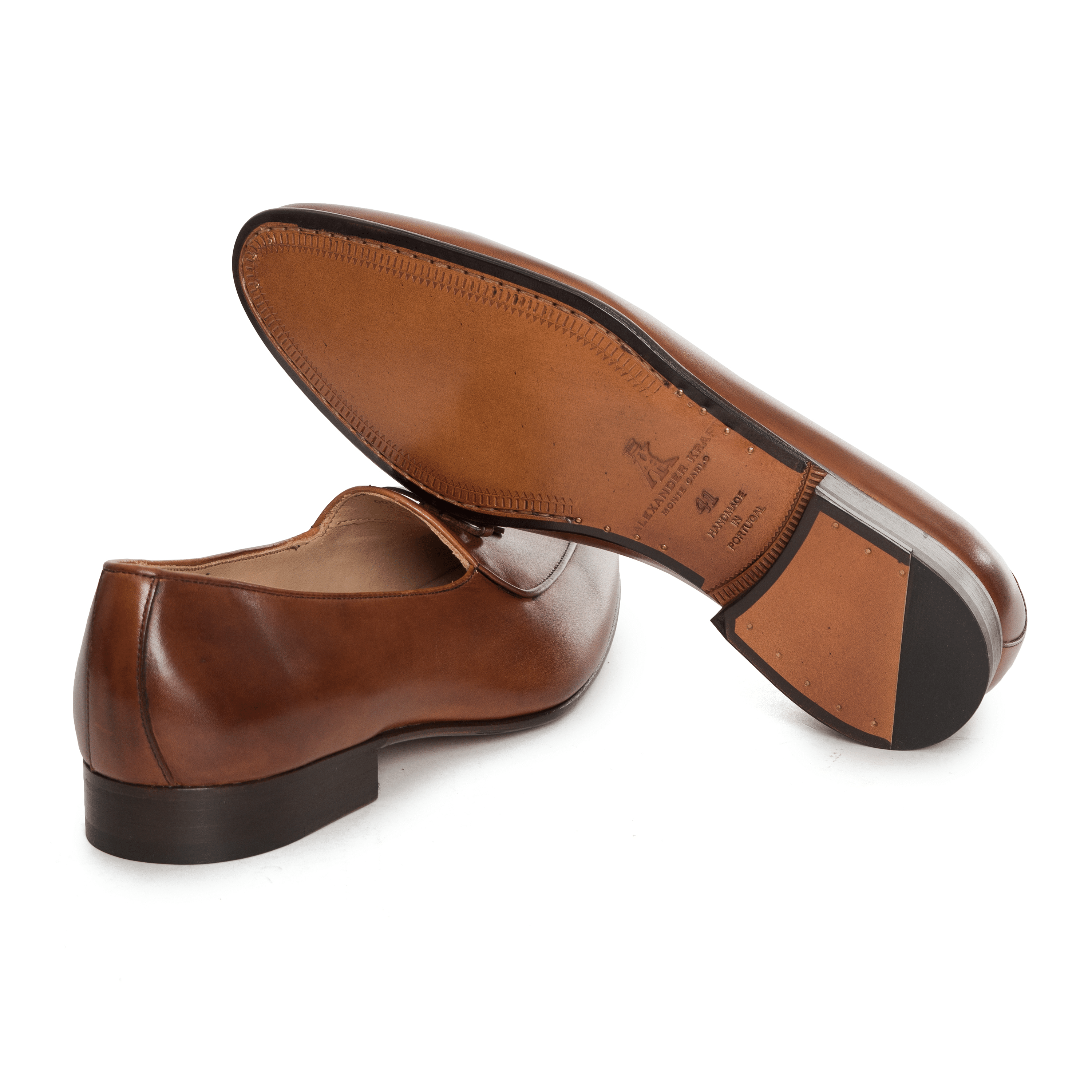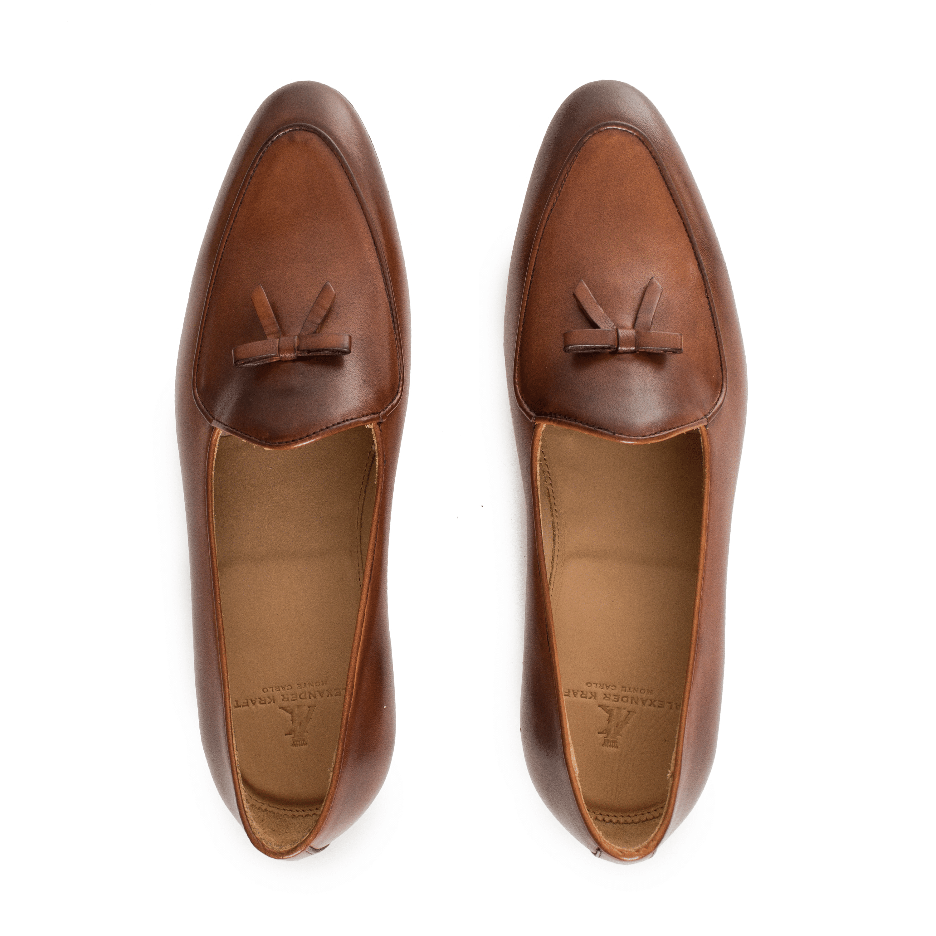 In creating his perfect pair of Belgian loafers, Alexander Kraft addressed these two points by designing a bespoke, slightly more closed, elongated shape that adds a touch of masculinity to this particular model. In addition, the Alexander Kraft Monte Carlo Belgian loafers are hand-made by a small, artisanal cobbler in Portugal, and feature Blake-stitched leather soles of the highest quality. The material chosen is a precious caramel – colored calf leather that has been hand-burnished with darker accents. Other details include the traditional bow of Belgian Loafers.