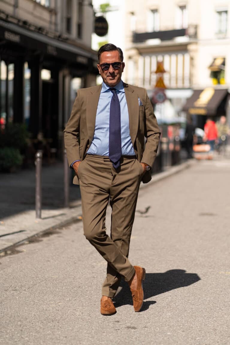 Cotton suiting is a summer essential as it is robust, comfortable and breathable. This fine cloth woven by Drapers in Italy has a very small amount (3%) of elastane to aid recovery and add a litte resilience. The rich khaki shade and twill weave adds a certain formality making this the perfect warm-weather business suit but it also has a playful side.