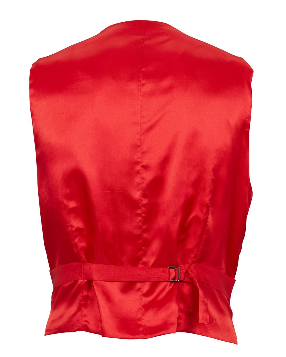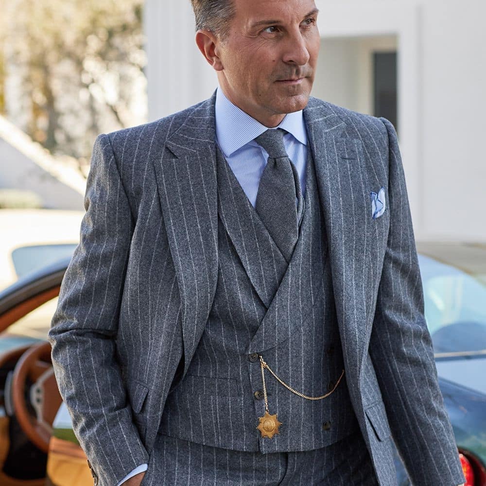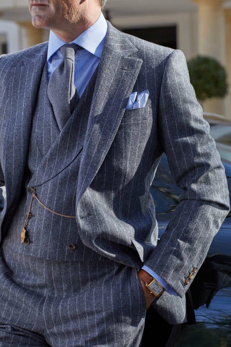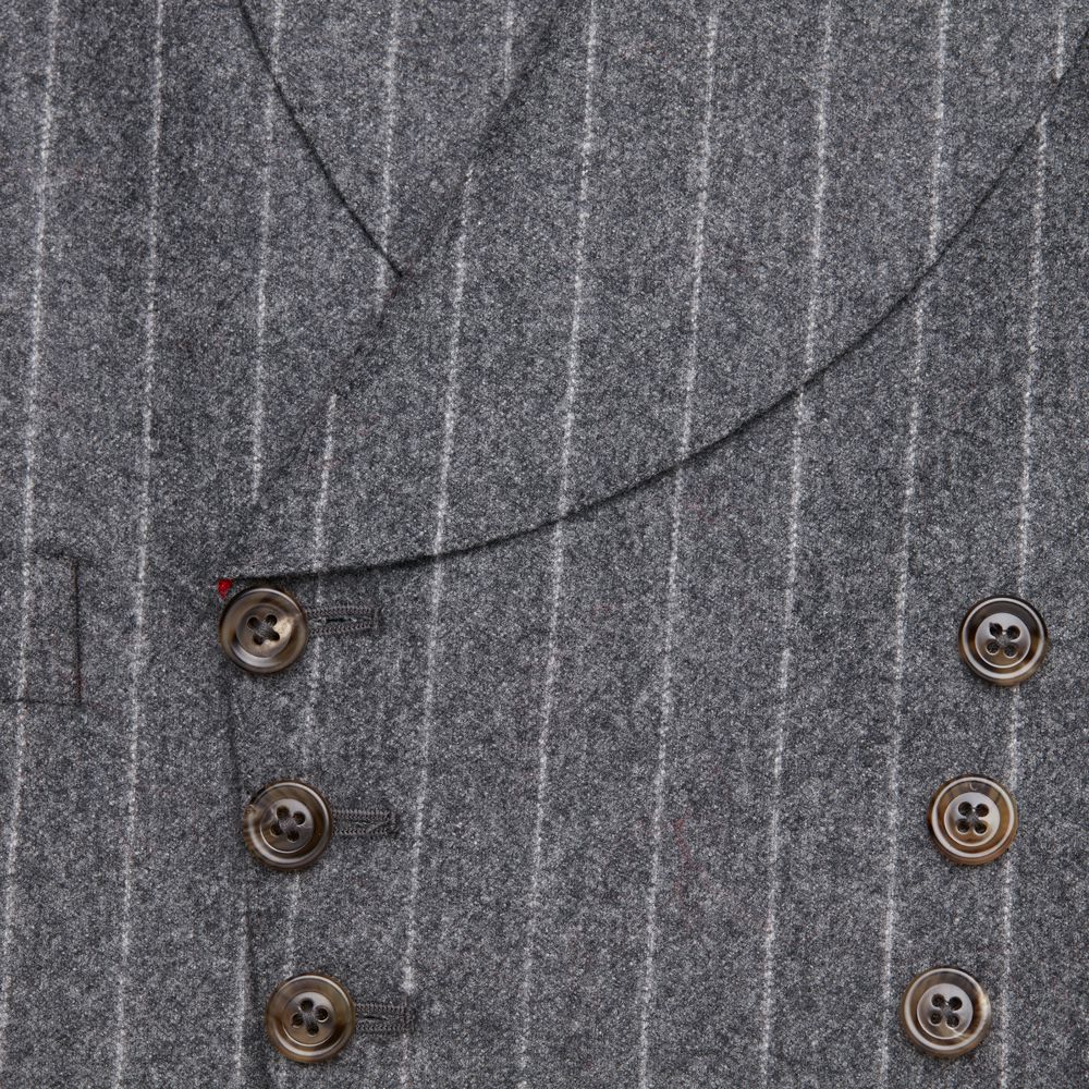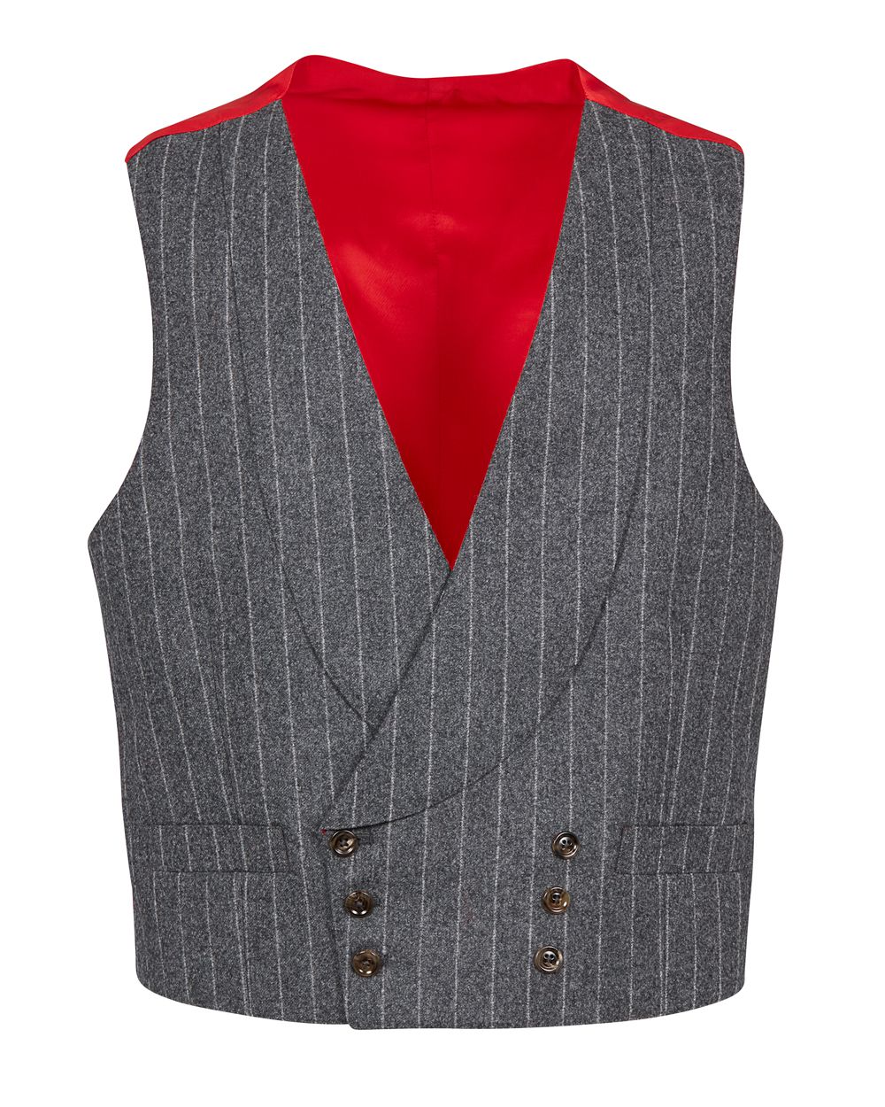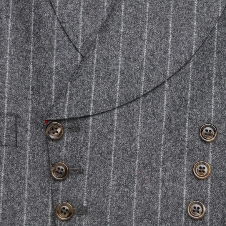 A six-button double-breasted waistcoat with a pronounced “V” shape for added elegance. It is made with a flannel from the world’s oldest (and still family-owned) mill, Vitale Barberis Canonico. It also features a shawl-collar lapel with generous belly. The silk back of the waistcoat is lined with the brands signature bright red silk and it has two jetted pockets, perfect for holding a pocket watch or Dupont lighter. You can also find a matching jacket and trouser all sold separately.