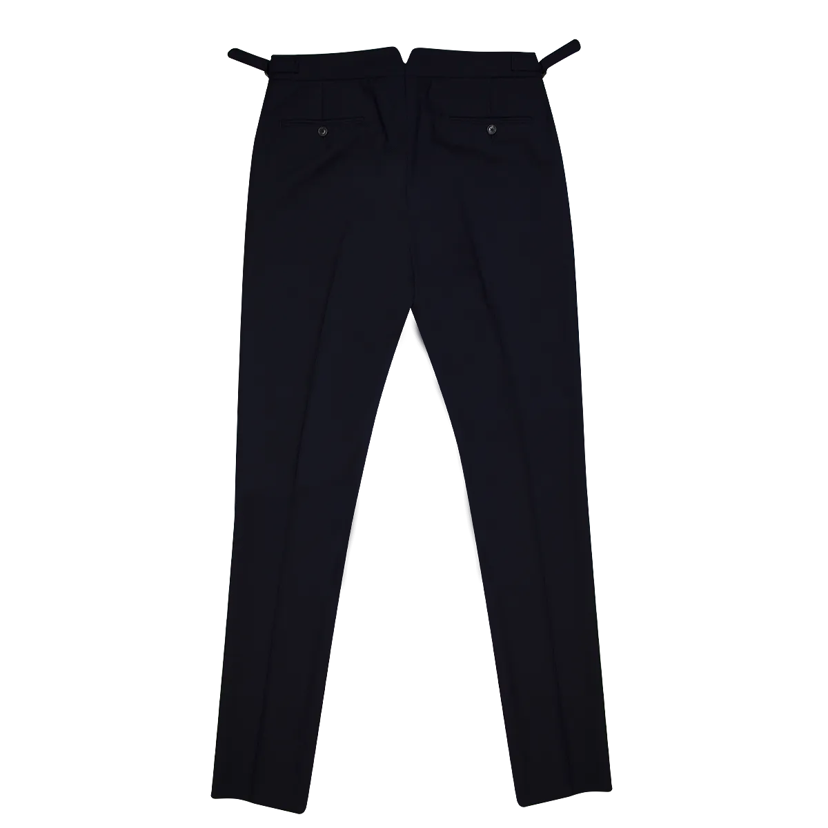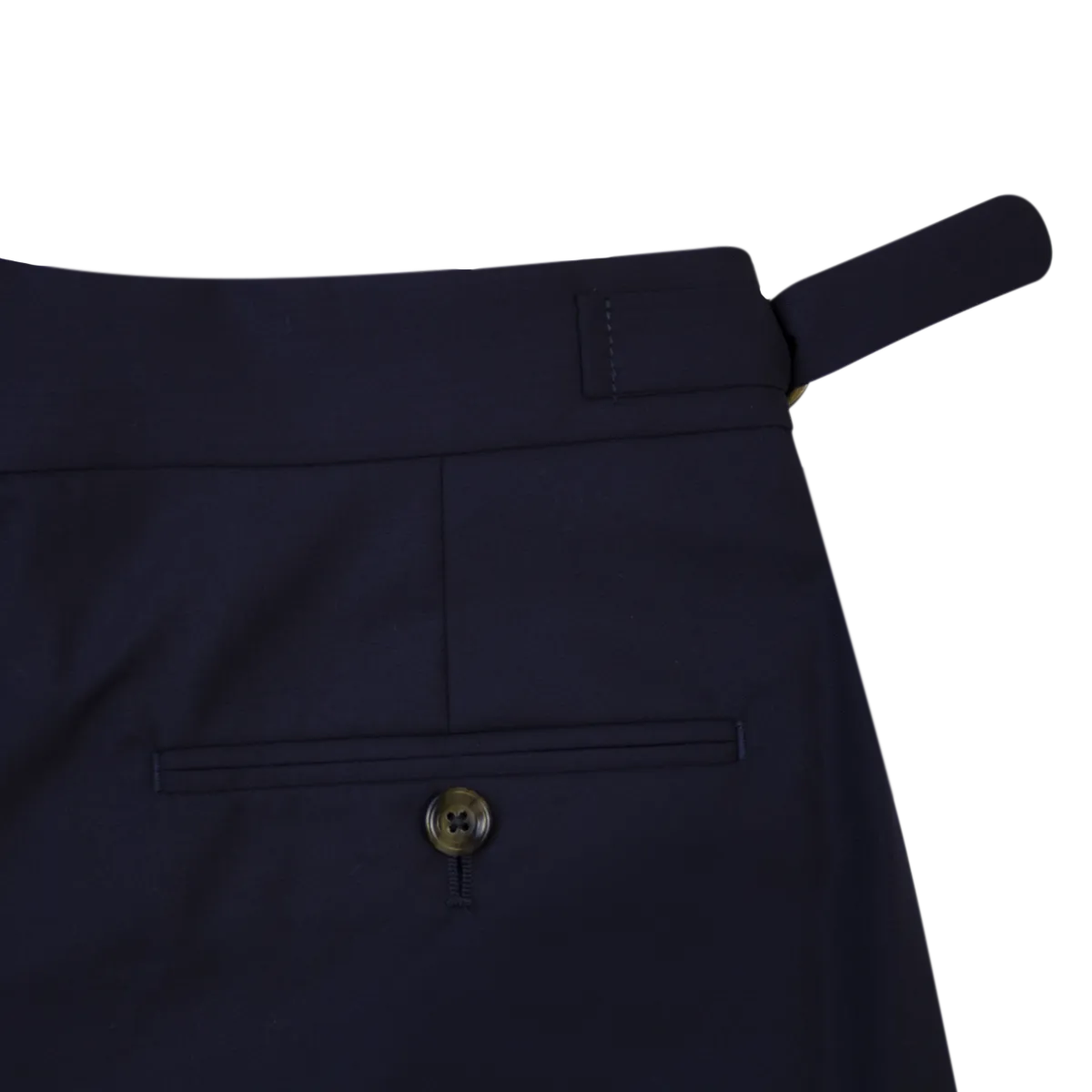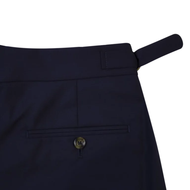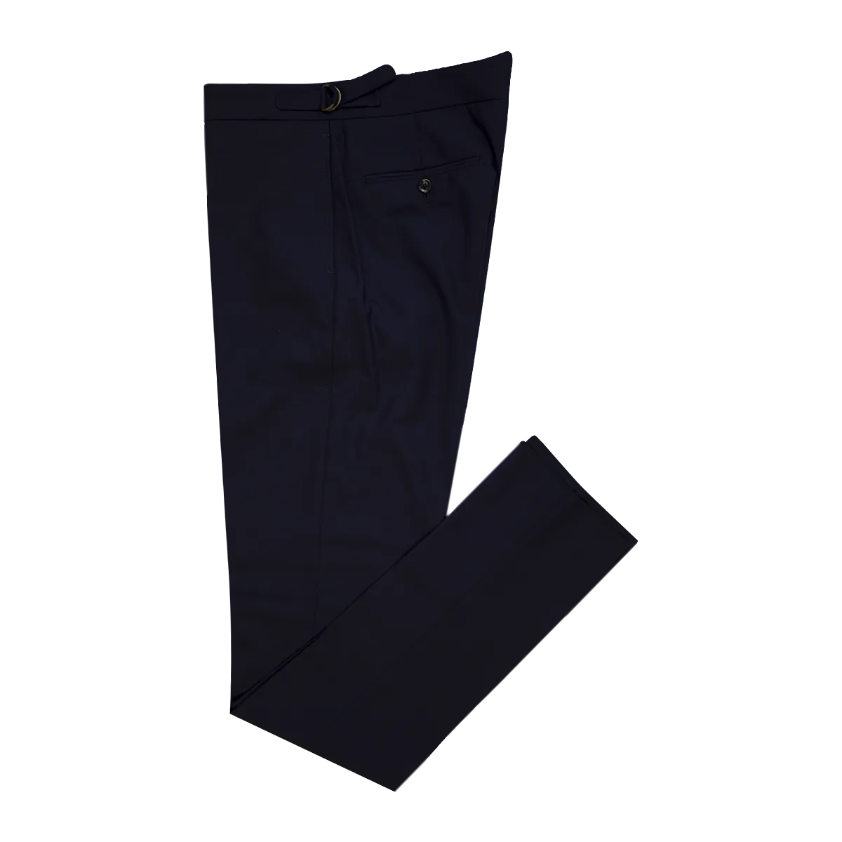 Cut on a plain weave dark navy lightweight wool worsted in a superfine 120s woven by Vitale Barberis Canonico this is the first AK MC contemporary Gurkha trouser that forms part of a suit and is designed to complement the Signature Barchetta jacket and there is also a double-breasted waistcoat option in the same fabrication. However, like all AK MC tailoring these trousers can be worn with a variety of jackets or sweaters.