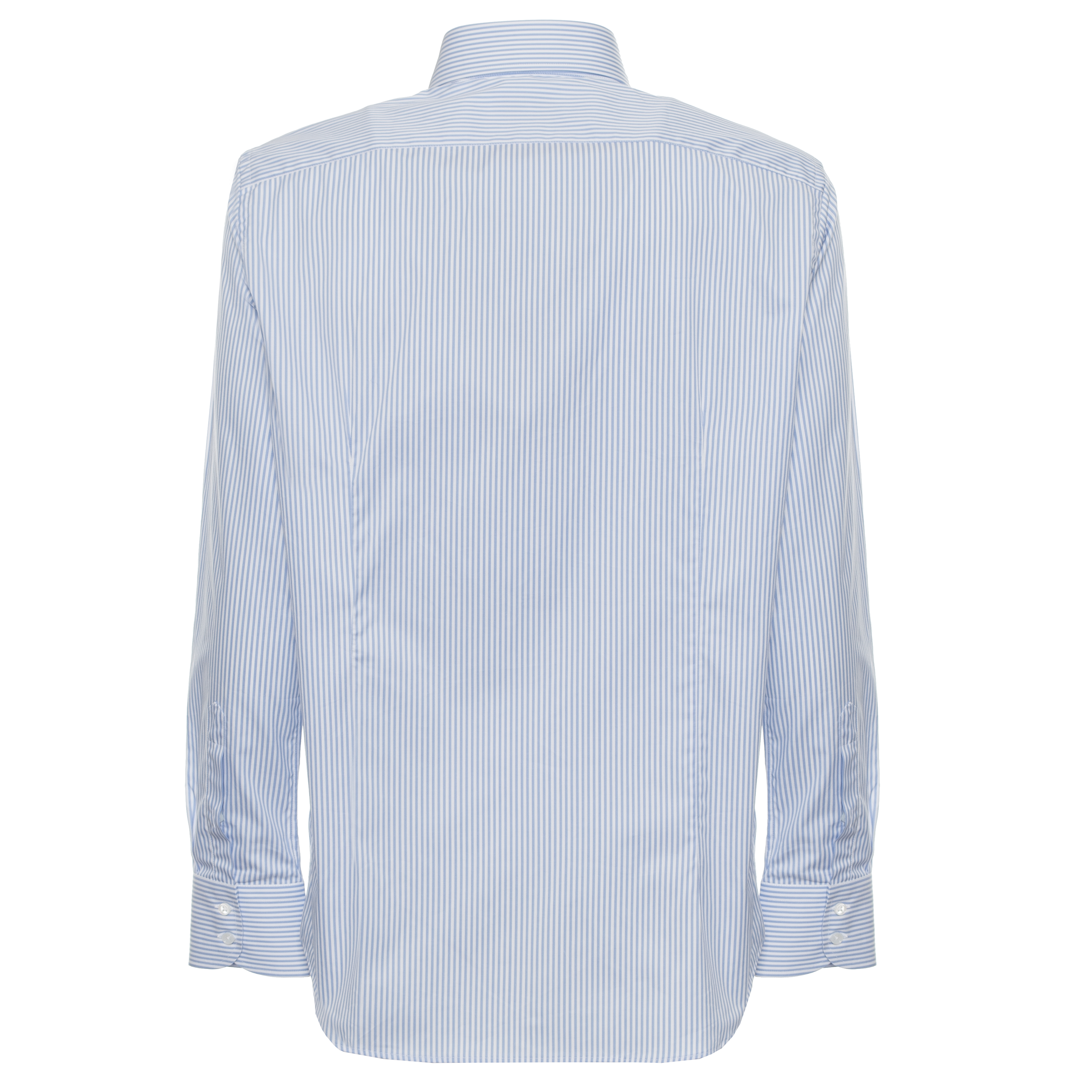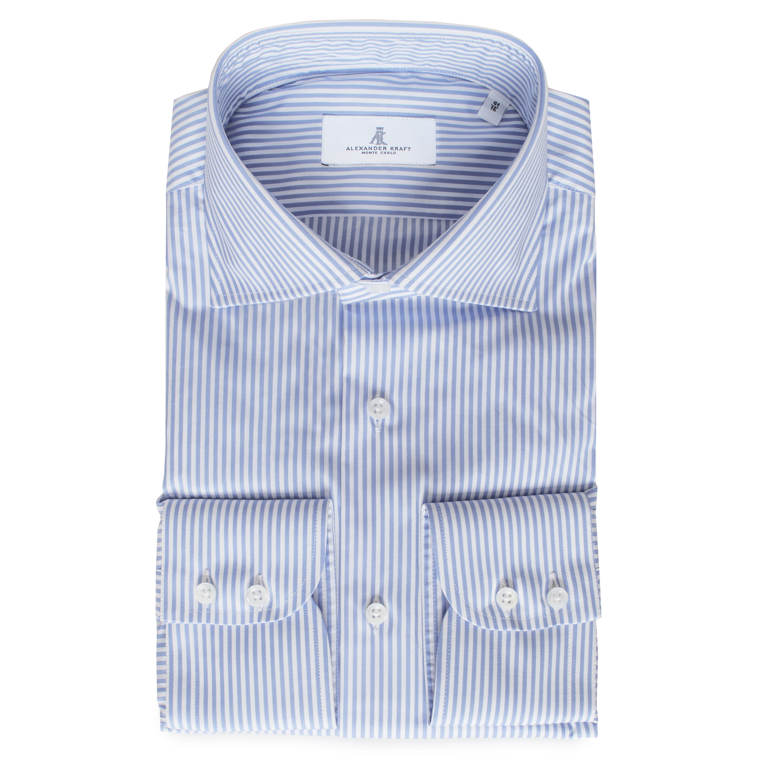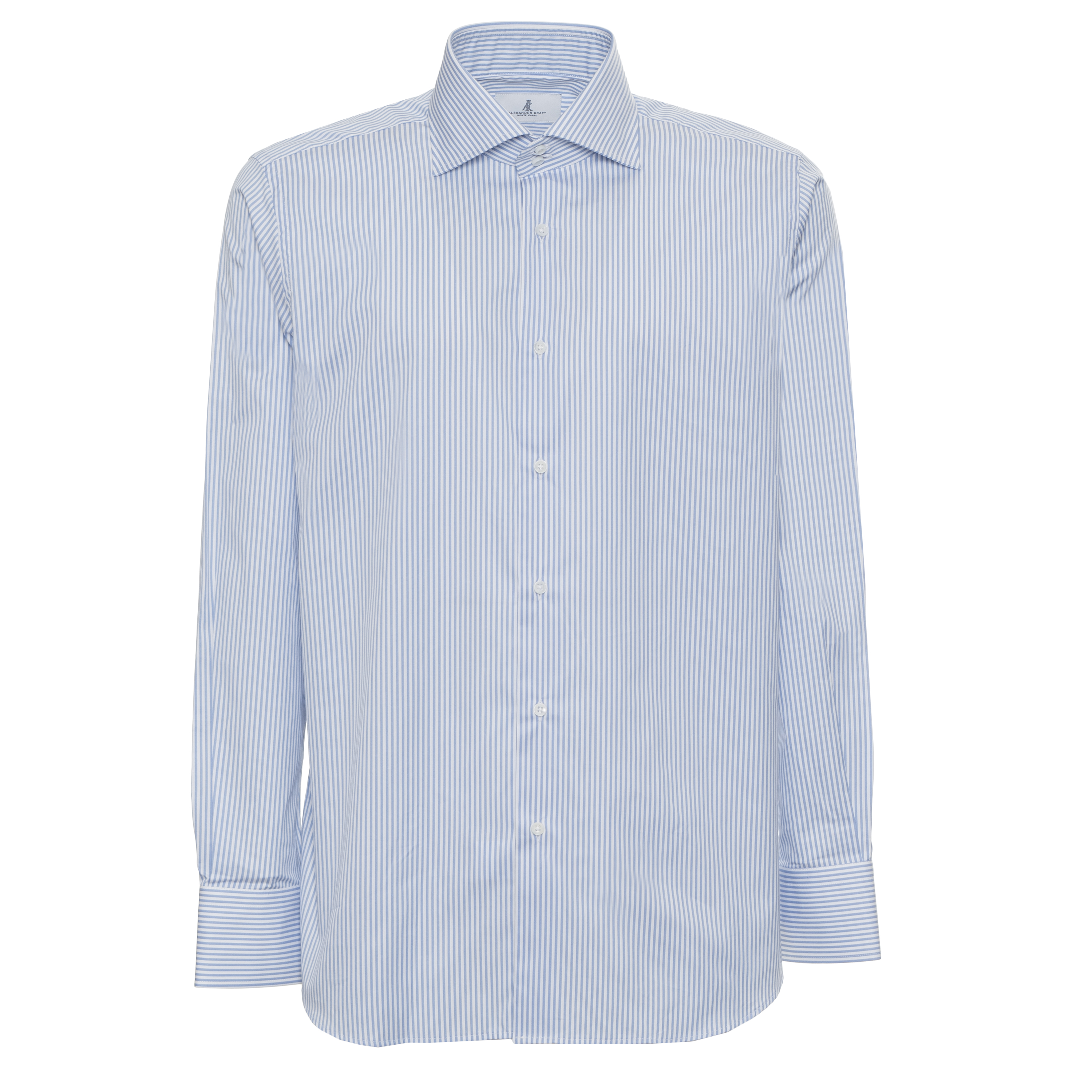 Synonymous with the AK MC sartorial enactment, the blue Bengal stripe shirt – a perennial shirt pattern – has been delectably refined to express the very best business and pastime elegance, and for this latest addition, it appears in a wider stripe in a discerning sky blue twill hue.